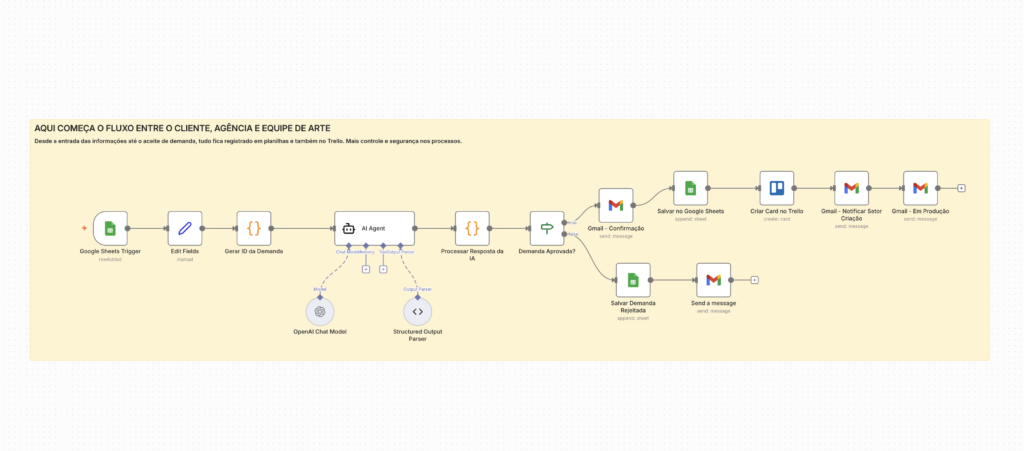Esse fluxo com Inteligência Artificial possibilita que as agências possam receber demandas de clientes, classificar, aprovar e enviar solicitação através do Trello, Asana, Monday ou por e-mail.