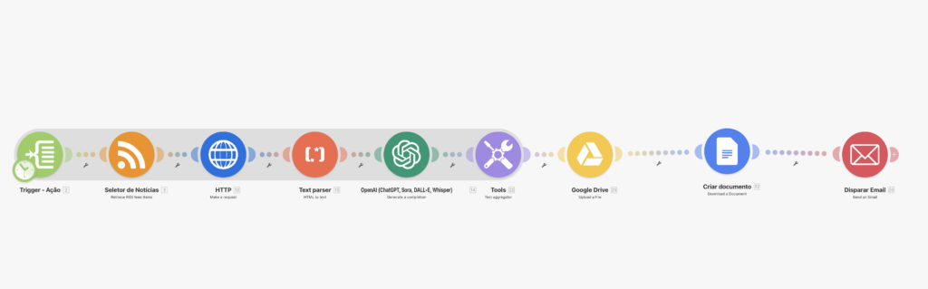 Esse fluxo com Inteligência Artificial possibilita que você faça o envio de conteúdo específico com disparos regulares para equipe de vendas, marketing, inovação sobre o principais temas que interessam ao negócio.